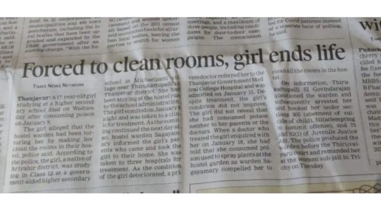 এম লাবণ্য, থাঞ্জাভুরের কাছে থিরুকাট্টুপল্লীর সেক্রেড হার্ট হায়ার সেকেন্ডারি স্কুলে অধ্যয়নরত 17 বছর বয়সী মেয়ে, তার পড়াশোনা চালিয়ে যাওয়ার জন্য স্কুলের দ্বারা খ্রিস্টান ধর্মে ধর্মান্তরিত করার জন্য তাকে নির্যাতন করা হয়েছিল বলে অভিযোগ করার পরে বিষ পান করে আত্মহত্যা করেছে৷ স্কুলটি থাঞ্জাভুর জেলার থিরুকাট্টুপল্লীতে অবস্থিত।