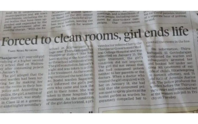 এম লাবণ্য, থাঞ্জাভুরের কাছে থিরুকাট্টুপল্লীর সেক্রেড হার্ট হায়ার সেকেন্ডারি স্কুলে অধ্যয়নরত 17 বছর বয়সী মেয়ে, তার পড়াশোনা চালিয়ে যাওয়ার জন্য স্কুলের দ্বারা খ্রিস্টান ধর্মে ধর্মান্তরিত করার জন্য তাকে নির্যাতন করা হয়েছিল বলে অভিযোগ করার পরে বিষ পান করে আত্মহত্যা করেছে৷ স্কুলটি থাঞ্জাভুর জেলার থিরুকাট্টুপল্লীতে অবস্থিত। লাবণ্য আরিয়ালুর জেলার ভাদুগাপালয়াম গ্রামেরRead More →