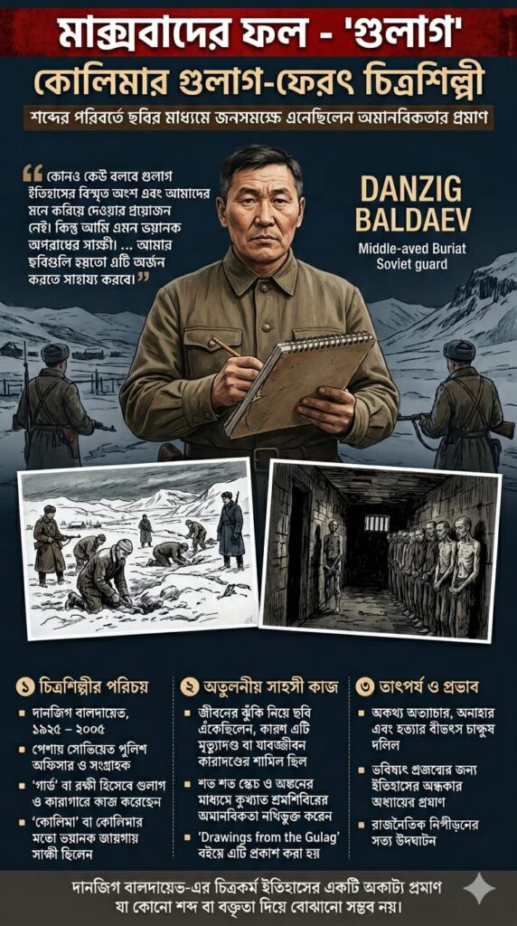 সোভিয়েত ইউনিয়নের ইতিহাসে একটি অন্যতম অন্ধকার এবং যন্ত্রণাদায়ক অধ্যায় হলো ‘গুলাগ’। এটি ছিল একটি বিস্তৃত শ্রমশিবিরের জাল, যেখানে রাজনৈতিক ভিন্নমতাবলম্বী, বুদ্ধিজীবী, এবং সাধারণ মানুষকে অমানবিক পরিস্থিতিতে দাস শ্রমে বাধ্য করা হতো। গুলাগের বিভীষিকা এবং এই নরকযন্ত্রণা থেকে ফিরে এসে বিশ্বকে সত্য জানানো দুই সাহসী ব্যক্তি – চিত্রশিল্পী দানজিগ বালদায়েভ এবং লেখক ভারলাম শালামভ মার্ক্সবাদের প্রয়োগের ভয়াবহতার প্রমাণ রেখে গেছেন।
