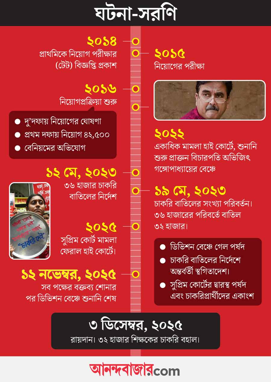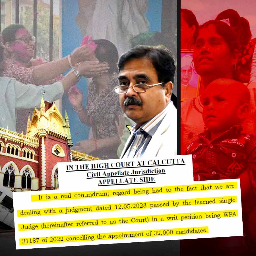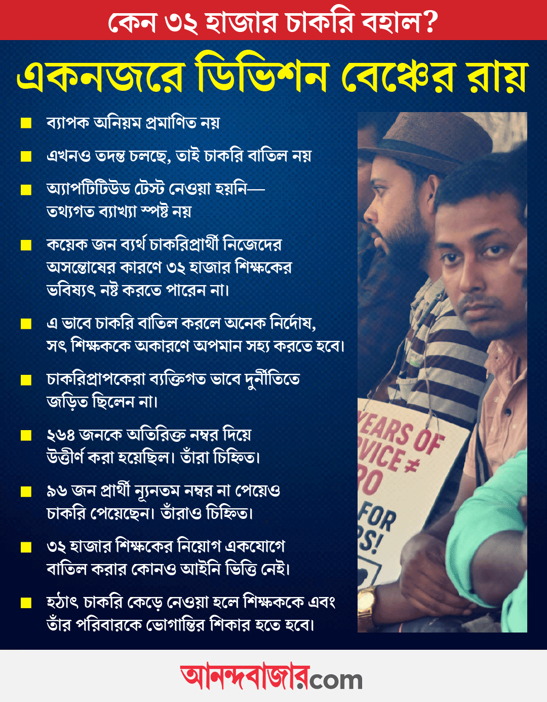 - কয়েক জন ব্যর্থ চাকরিপ্রার্থী নিজেদের অসন্তোষের কারণে এ ভাবে ৩২ হাজার শিক্ষকের ভবিষ্যৎ নষ্ট করার সুযোগ পেতে পারেন না। এই ভাবে চাকরি বাতিল করলে অনেক নির্দোষ, সৎ শিক্ষককে অকারণে অপমান, লজ্জা ও কলঙ্ক সহ্য করতে হবে। তা ছাড়া, তদন্ত এখনও চলছে। চাকরি বাতিল না-করার সেটাও অন্যতম কারণ।
