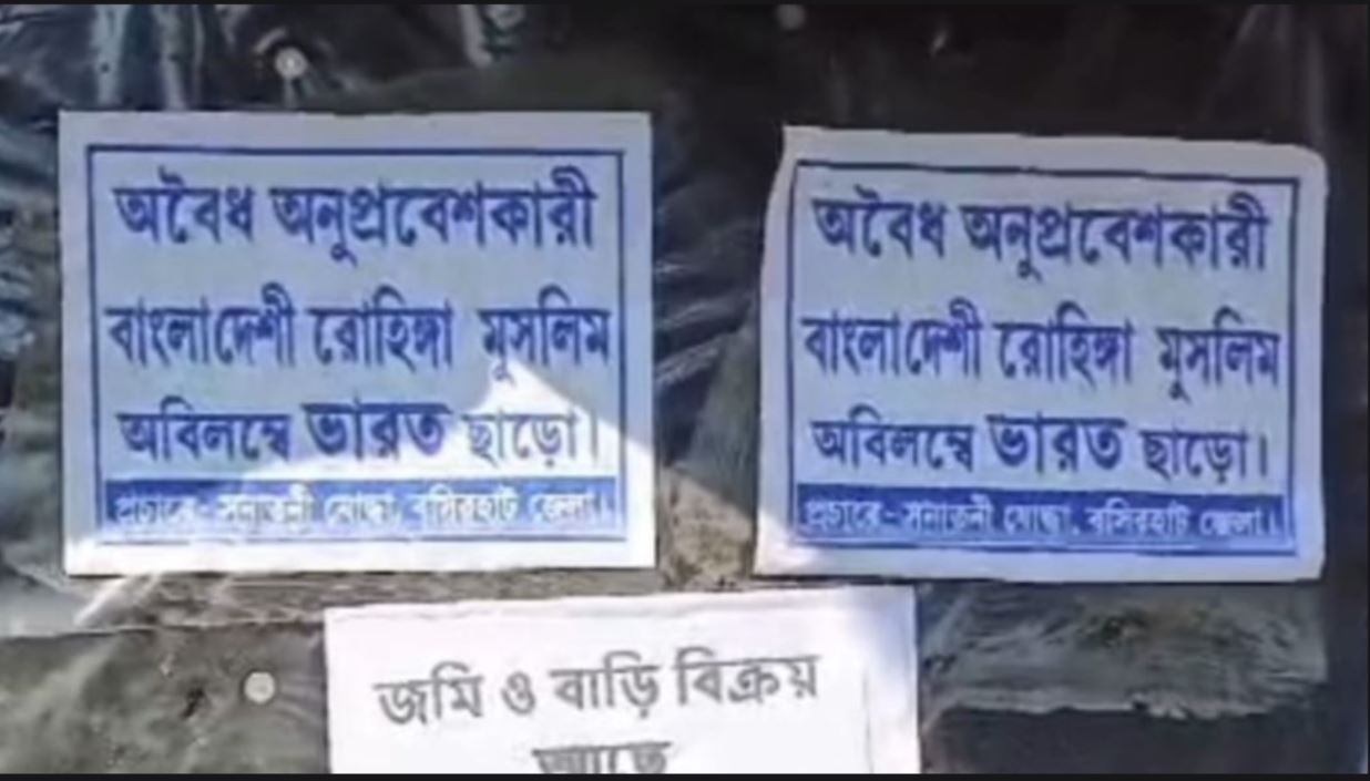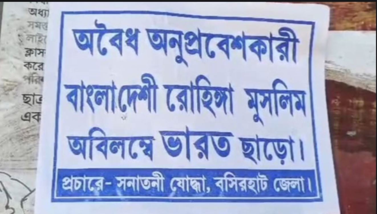 সাদা কাগজে নীল কালিতে ছাপানো সেই পোস্টারে লেখা, ‘অবৈধ অনুপ্রবেশকারী বাংলাদেশি, রোহিঙ্গা মুসলিম অবিলম্বে ভারত ছাড়ো’। এই পোস্টারে হাংলাদেশ সীমান্ত লাগোয়া বসিরহাটে তীব্র চাঞ্চল্য।