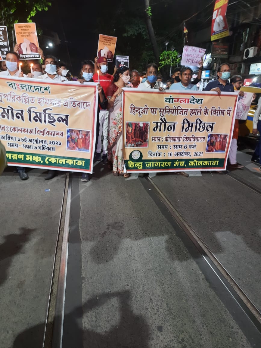 রাজনৈতিক দলের নেতা-নেত্রীরা ধুনুচি নাচে ব্যস্ত অথচ ওপার বাংলার হিন্দুরা অষ্টমীর দিনেই দুর্গা প্রতিমা বিসর্জনের বাধ্য হয়েছে। বাংলাদেশের প্রশাসন যথাযোগ্য ব্যবস্থা এখন পর্যন্ত নেয়নি। তাই বাংলাদেশে হিন্দুদের উপর অত্যাচার,মন্দির পূজা মন্ডপ, ধর্মীয় প্রতিষ্ঠানে আক্রমণের প্রতিবাদে, ভারতবর্ষের হিন্দু সম্প্রদায় তাদের পাশে দাঁড়াতে সকলে মিলে হিন্দু জাগরণ মঞ্চের পক্ষ থেকে কলকাতায় বিশ্ববিদ্যালয় থেকে একটি মৌনমিছিল আয়োজিত হয়।